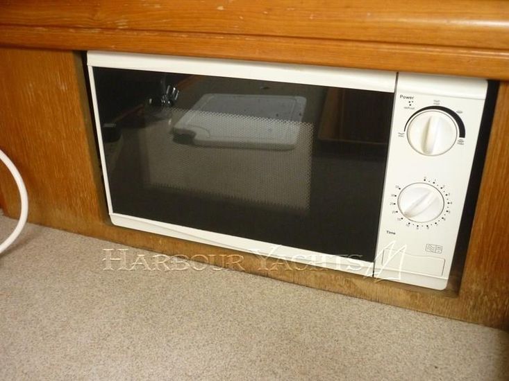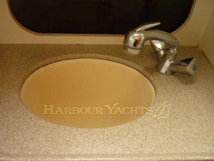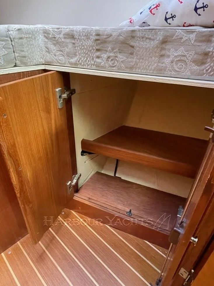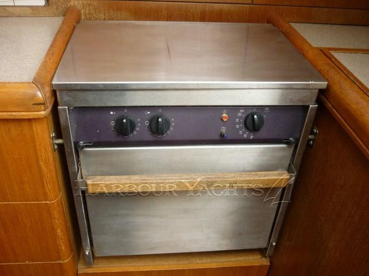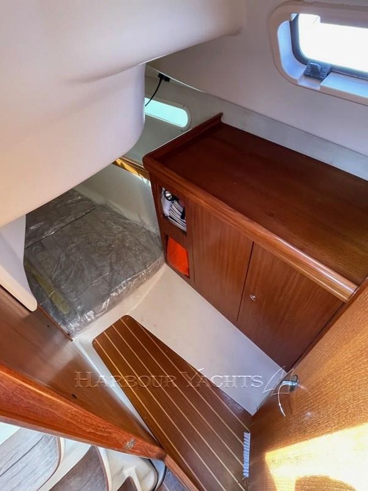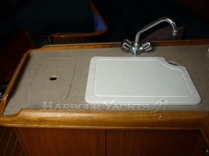 Double berth in forepeak with large storage locker. Double and single berths in main saloon to either side of drop-leaf dining table which also rises to ceiling level for stowage. Chart table and navigator station. Galley to starboard with large sink and pressurised hot and cold water. Twin burner hob, grill and oven. 12v/240v refrigerated cool box. Microwave. Aft cabin has large double berth with additional storage lockers. Separate heads compartment with Jabsco sea toilet. Vanity unit with wash hand basin, mixer tap and shower head. Pressurised hot and cold water system. Diesel fired warm air heating. Stereo system. 1.93m headroom. Upholstery (foam replaced 2019).
