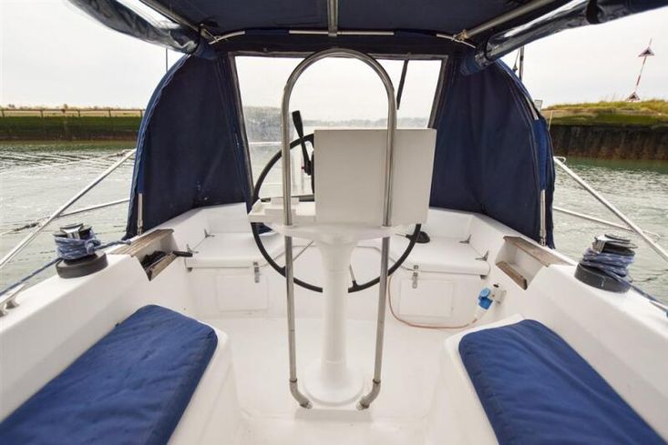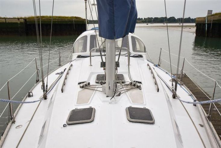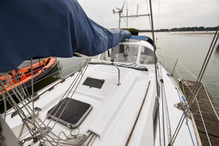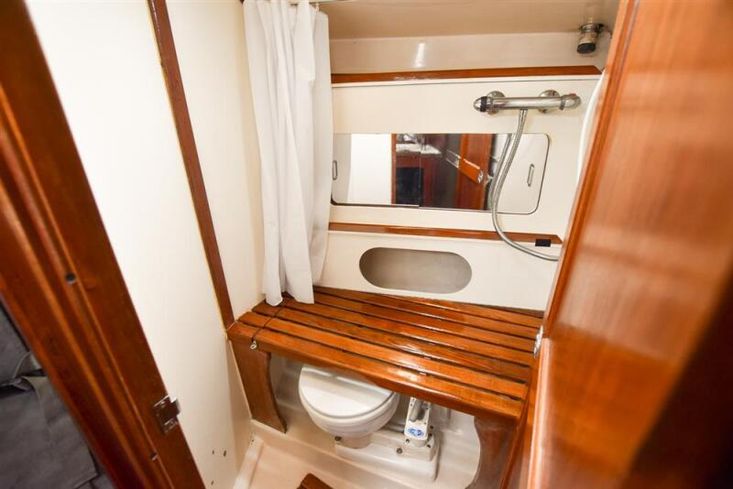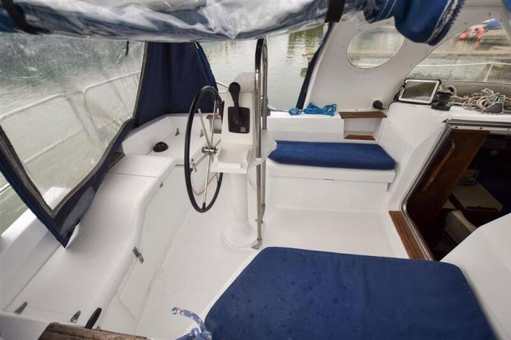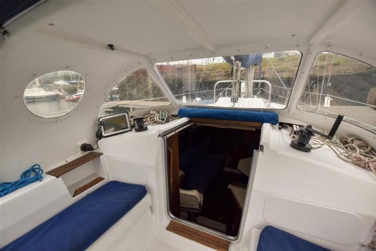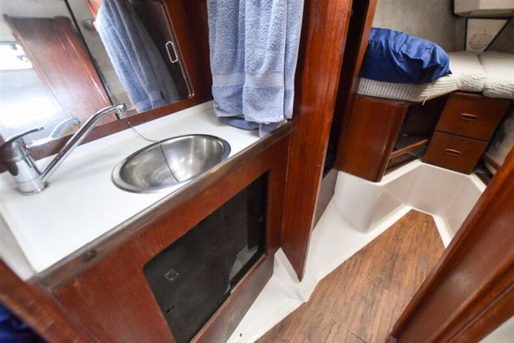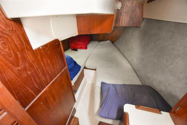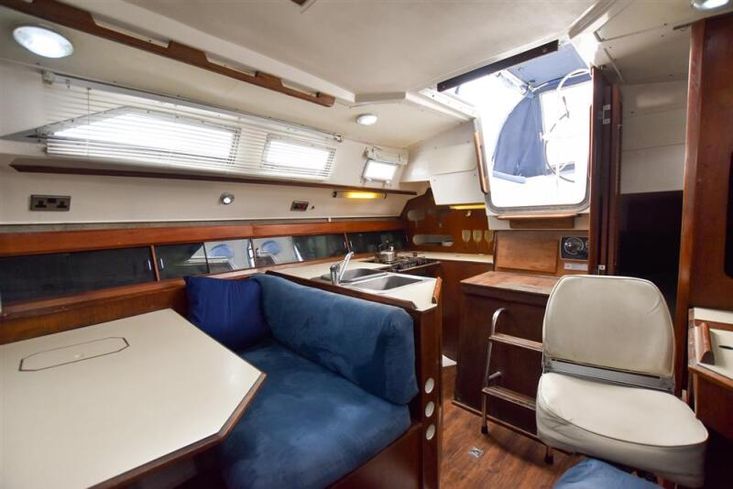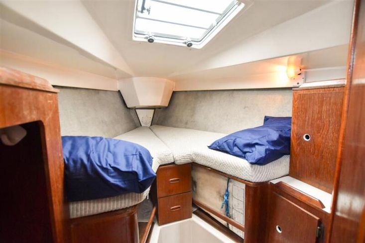 Up to seven berths in two cabins plus the saloon with excellent headroom and teak joinery. The forward cabin has a double V berth. Plenty of stowage under the berths, in hanging locker and stowage lockers. Heads compartment across the boat with stainless steel sink with hot and cold pressurised supply to port in vanity unit and marine toilet plus shower unit to starboard.