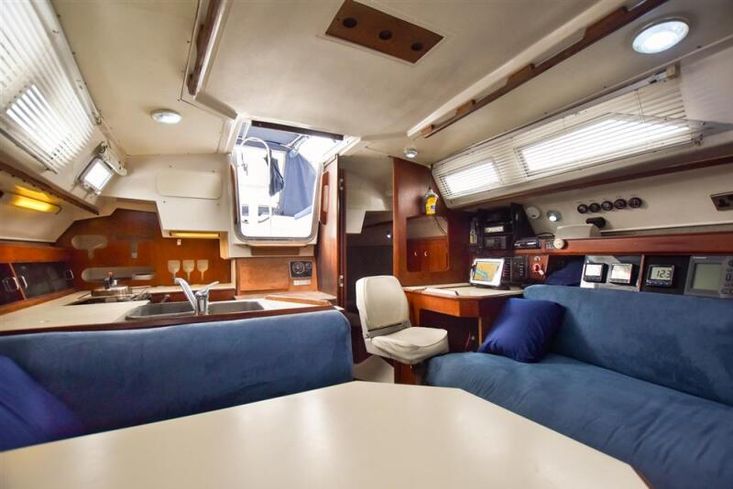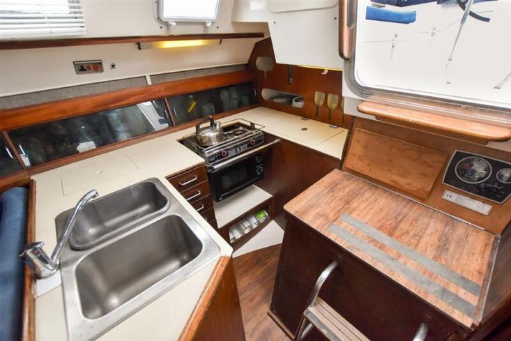The saloon has a large dinette to starboard (table drops to make a double berth) plus a settee berth to port. Aft of the settee is the outboard facing chart table with a dedicated PVC armchair. The very large U-shaped galley is to starboard and is equipped with gimballed 2 burner bio-ethanol cooker with microwave oven, fridge, double stainless-steel sinks and masses of storage.