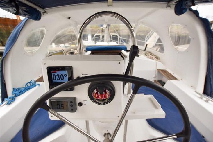- Raymarine depth instrument in cockpit