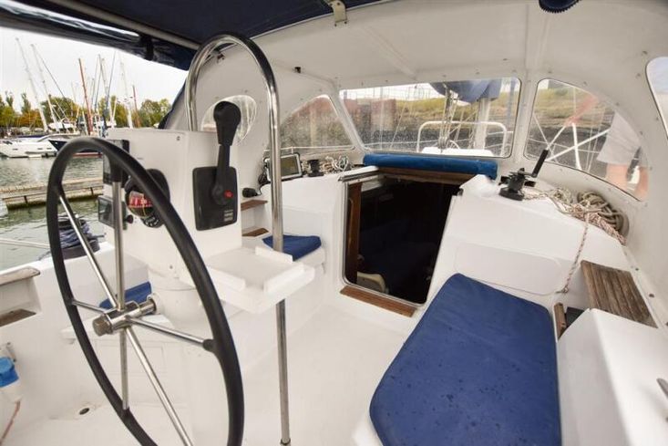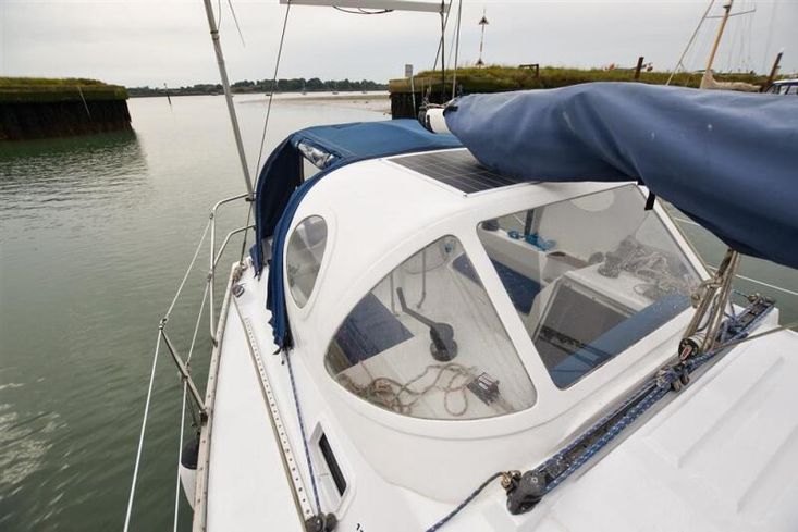 Built by Hunter Boats (USA) in 1983. White grp hull with blue style stripe. White grp coachroof with painted non skid decks. Cast iron fin keel (extended aft for ocean use). Wheel steering to spade rudder. Self draining cockpit and anchor well. Stainless steel safety rails. Teak coachroof hand rails. Alloy toe rails. Last surveyed in 2005.