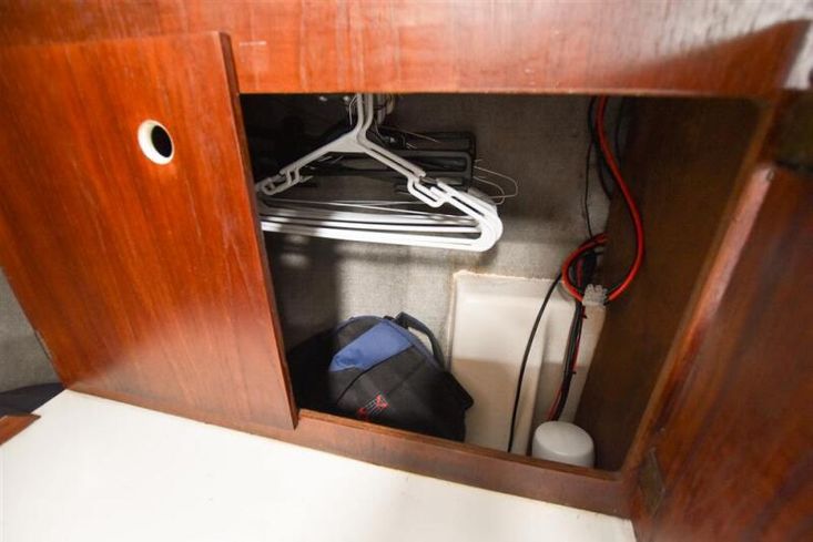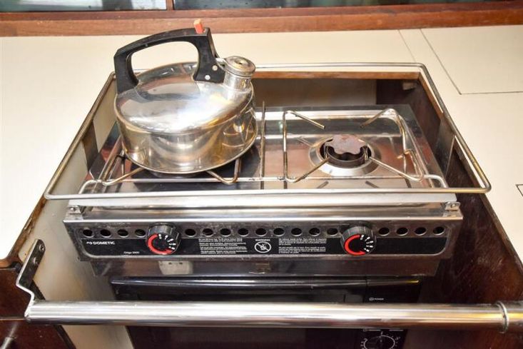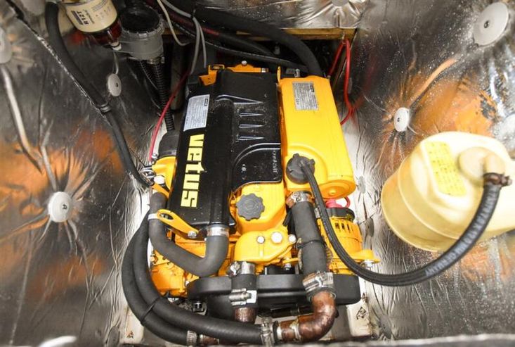 Located under companionway is the Vetus N3.29 marine diesel engine (new 2022). 29hp. Shaft drive to three bladed fixed propeller. 65 litre fuel tank plus holding tank converted for extra diesel capacity. The engine has logged only some 252 hours and has been serviced at 50 & 250 hours. Approx 6 knots cruising at some 1.5 litres per hour consumption (subject to fouling and loading).